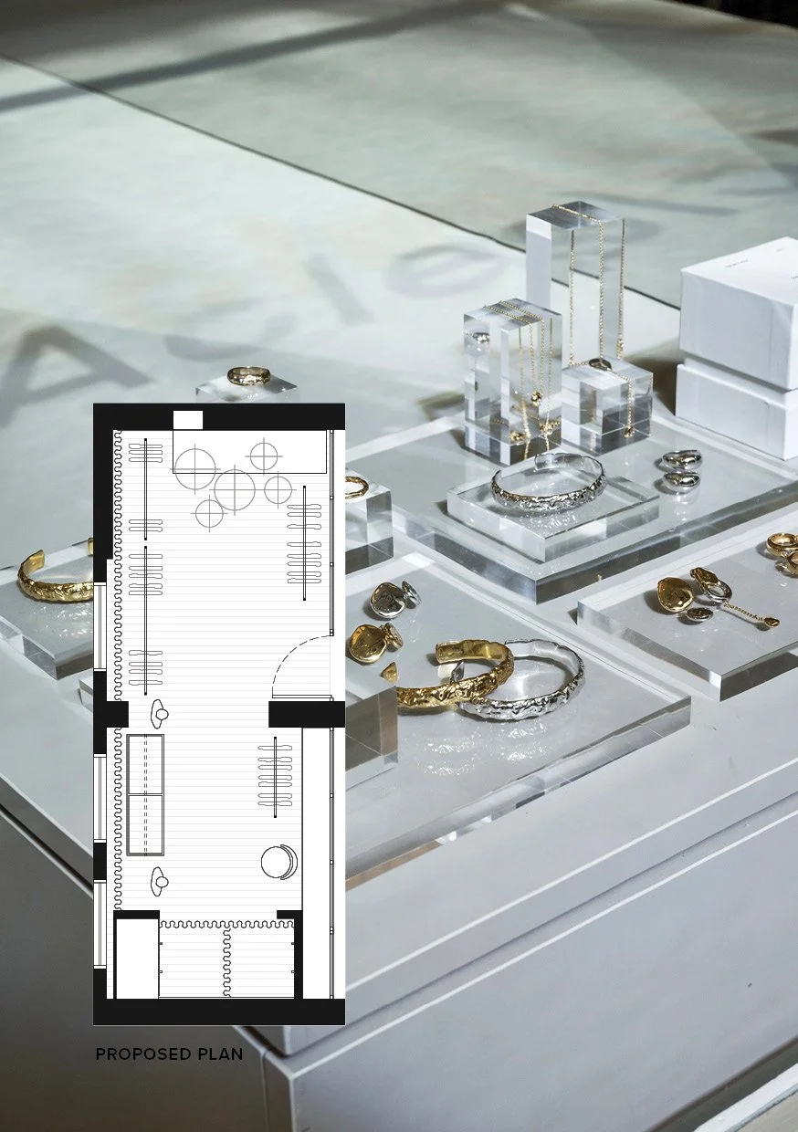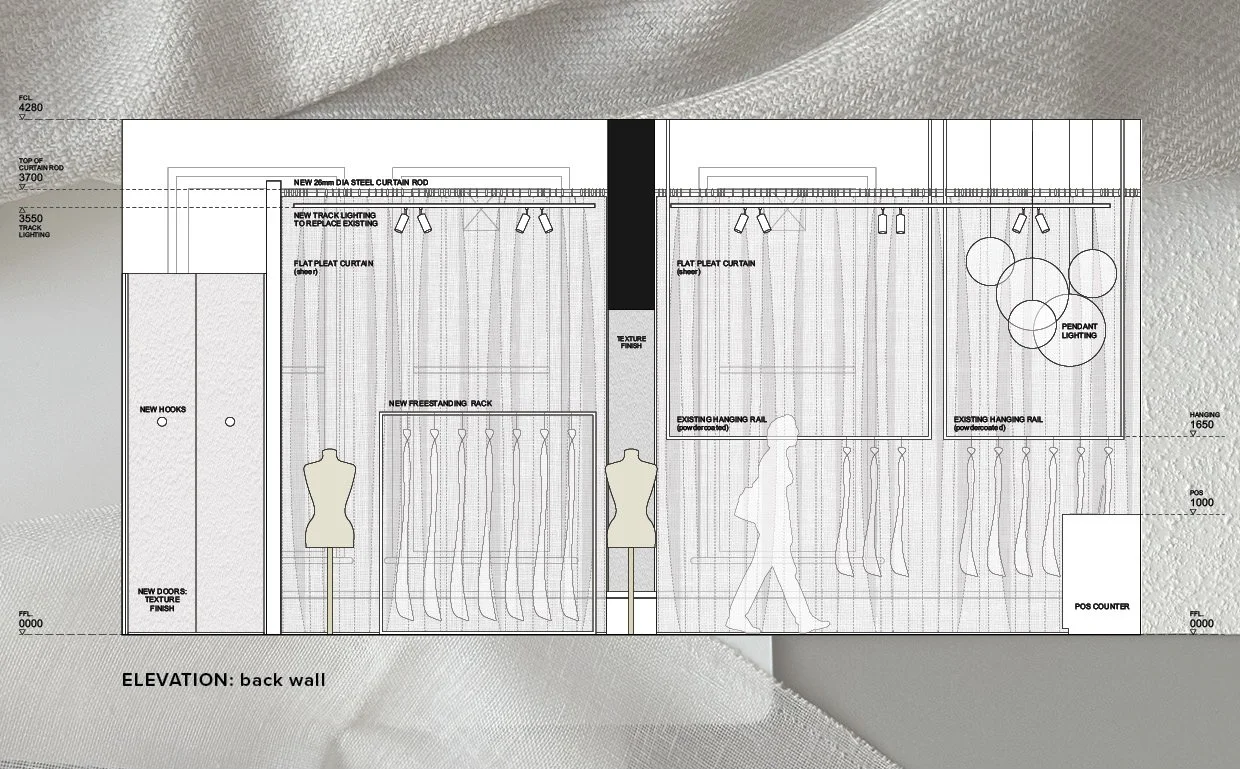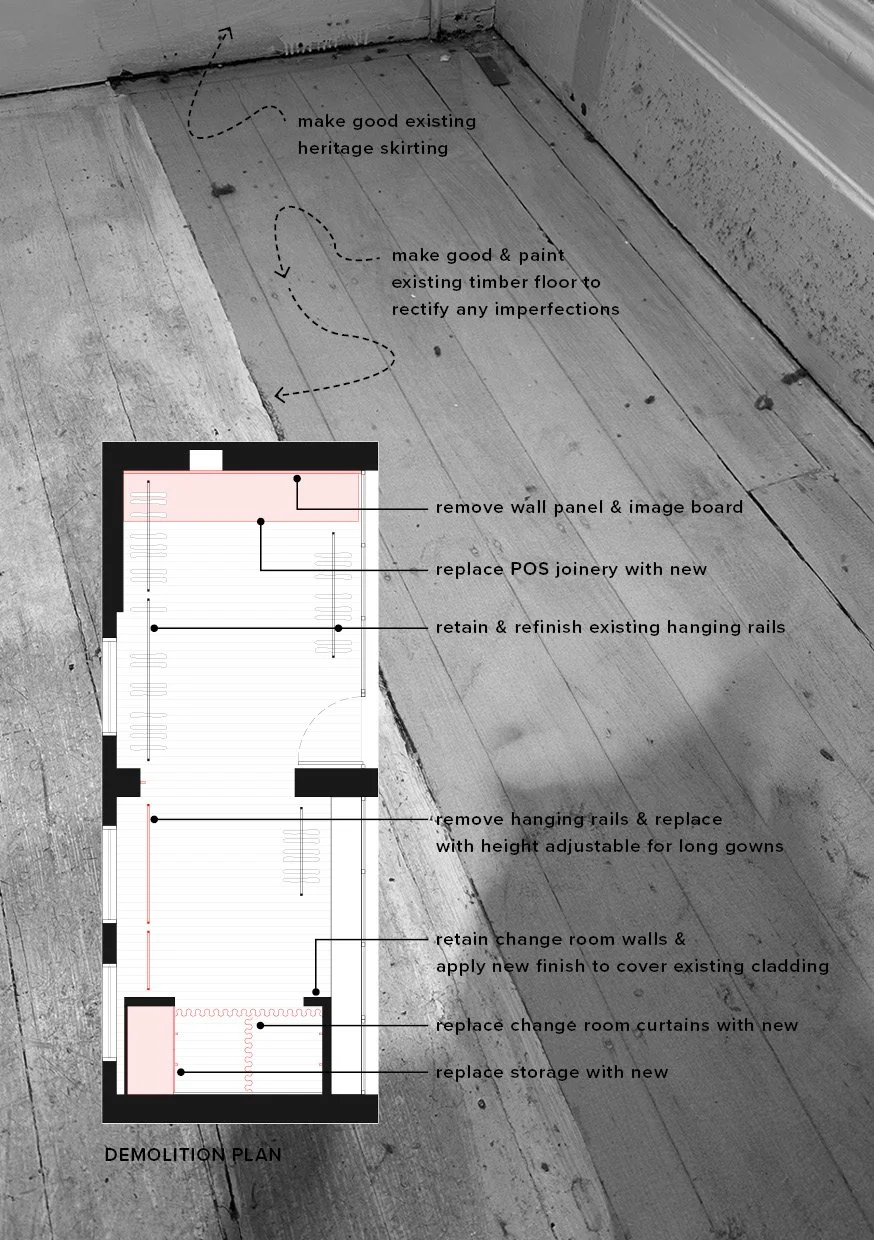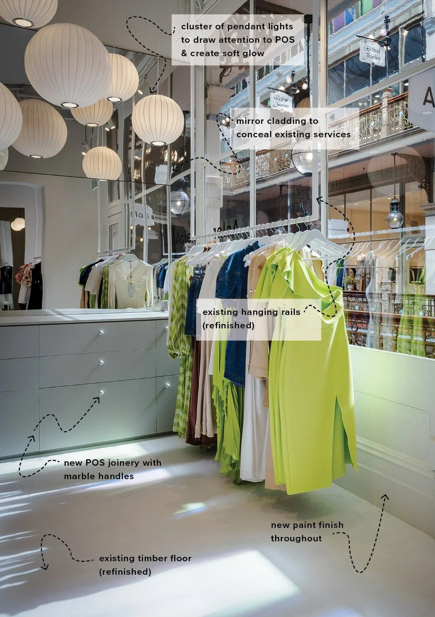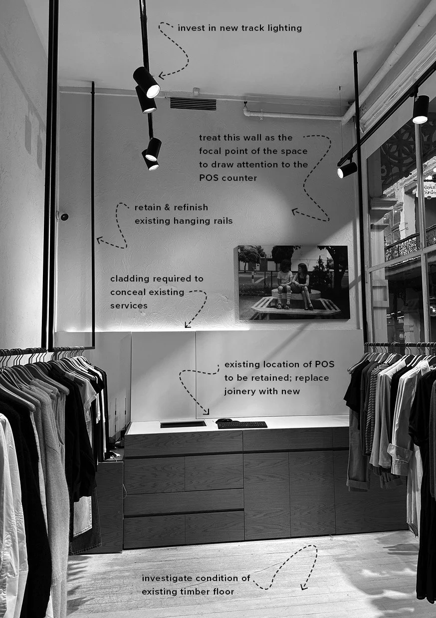 Inspect the space. Keeping in mind the budget and timeframe, we had to be discerning when reviewing the space. It was not a blank canvas, so we consider if existing elements can be repurposed to our advantage. The outgoing tenant is also a fashion brand, so the layout, hanging space and change rooms could be refreshed without being demolished. We identify where the budget should be invested and how the space can be transformed within our project parameters.
